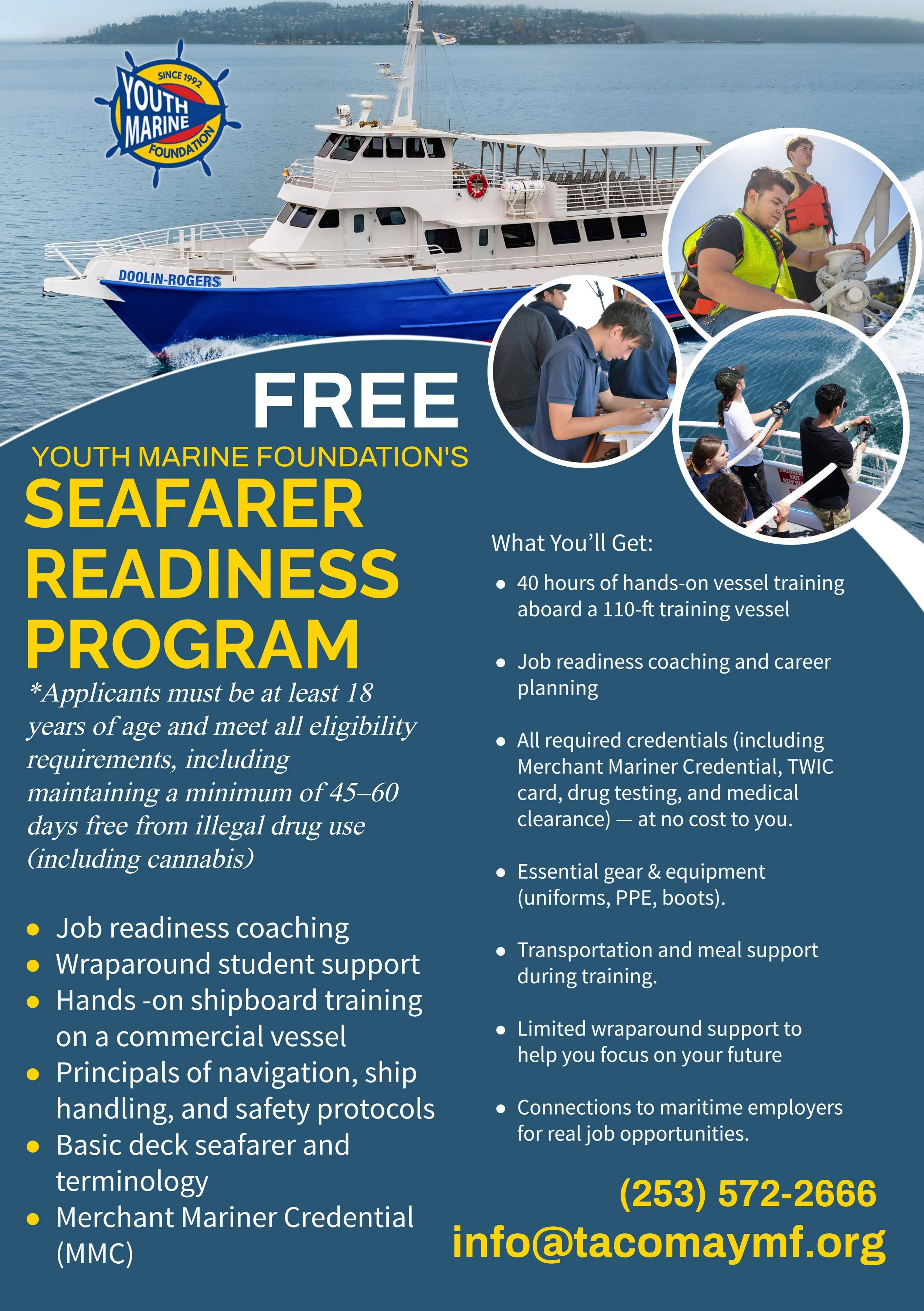 The Youth Marine Foundation is offering free maritime workforce training through the WAVE Seafarer Readiness Program, funded by the Washington State Department of Transportation.